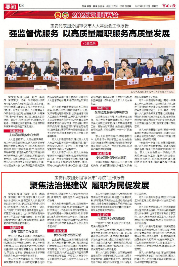 2月27日,在市七届人大六次会议分组审议中,宝安团市人大代表认真审议深圳市中级人民法院工作报告、深圳市人民检察院工作报告。代表们一致认为,“两院”工作报告总结成绩客观全面、部署工作措施有力,让人真切感受到守护社会公平正义的力量和温度。代表们围绕智慧“两院”建设、营商环境优化、普法宣传等方面提出意见建议。